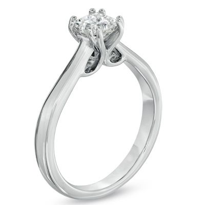 On that special day, promise to love, honor and cherish her with a dazzling diamond solitaire engagement ring. Beautifully fashioned in 18K white gold, a 3/4 ct. princess-cut certified Canadian diamond center stone sparkles brightly in the traditional four-prong setting. The diamond boasts a color ranking of I and a clarity of SI2 - an exceptional stone. Certified Canadian diamonds are accompanied with a Certificate of Authenticity guaranteeing its Canadian origin. This style also includes a certificate that includes a photo and description of the diamond, which guarantees quality and can be used for insurance purposes
