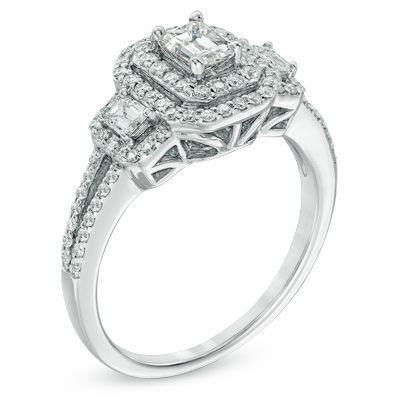 Honor her with this amazing diamond engagement ring. Fashioned in 14K white gold, this ring showcases three shimmering emerald-cut diamonds, the largest an impressive 3/8 ct., each surrounded by a double frame of shimmering round accent diamonds. This trio tops a diamond-lined double shank. Engraved inside the gold band, the words "Past, Present, Future" and two accent diamonds remind her of your promise to be by her side, always. This ring captivates with 1 ct. t.w. of diamonds and a bright polished shine.